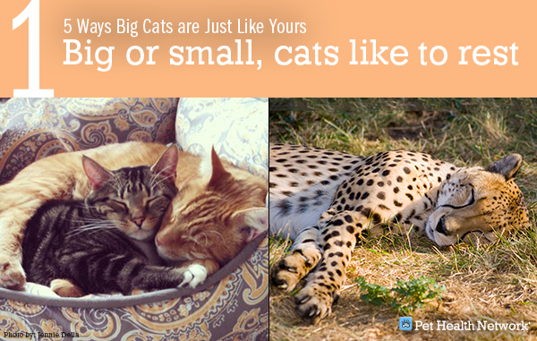 Recently, while on a trip to Africa, I was fortunate enough to really observe more ‘big cats’ than I had ever seen before. I often marvel at how similar the behaviors of my own cats are to the behaviors of their wild cousins like lions, leopards and cheetah. Clearly some behaviors are learned from ancestral cats and genetically woven into the fiber of these amazing animals both wild and domestic. Here are 5 ways big cats are just like yours: