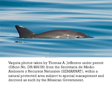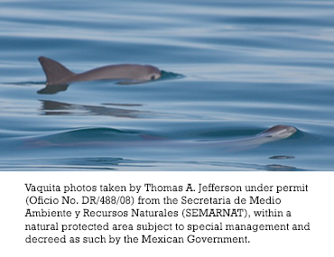 Vaquita photos taken by Thomas A. Jefferson under permit (Oficio No. DR/488/08) from the Secretaria de Medio Ambiente y Recursos Naturales (SEMARNAT), within a natural protected area subject to special management and decreed as such by the Mexican Government.